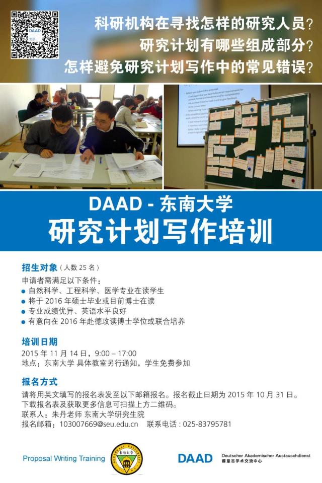 为更好地帮助有意向在德国读博的学生掌握英语研究计划的写作技巧,更顺利地申请德国博士位置及奖学金,德意志学术交流中心(DAAD)和东南大学将于2015年11月14日共同开展研究计划写作培训(Proposal Writing Training),培训的内容包括: Ø为什么研究计划如此重要? Ø科研资助机构在寻找什么样的研究人员? Ø研究计划有哪些重要的组成部分? Ø如何理解研究问题和研究假设的重要性? Ø如何设计研究问题? Ø不同的研究方法和研究设计有哪些特点? Ø如何将学到的技巧用于自己的申请当中?