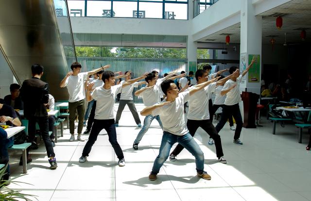 舞蹈时间半小时前,快闪团队就已经齐聚食堂,并开始积极地准备。舞蹈组同学们装作无辜“路人”吃饭聊天玩手机,时刻准备着听音而动。同时,食堂各个门口也开始宣传即将发生的神秘事件,看得出,在今天的明媚阳光下,同学们都热情满满也期待满满。食堂如往常般的平静外表下早已暗潮涌动。随着鼓点明显的前奏开始,食堂突然迸发出音乐,周围吃饭及排队的同学们先是一惊,紧接着,一群白衣灵魂舞者从四面八方缓步迈进食堂中的一块空地,同学们恍然大悟后又是一喜;坐着吃饭的同学们也抬起头关注这次活动,还伴有时不时的讨论;站着等待的同学们也缓缓聚集过来,以一个更好的视角欣赏这一次活动舞蹈。不少人拿出手机,记录下这舞动的一刻。音乐间奏中,6名同学高举“ME无械可击”的标识在舞者之间穿插走过,迎来阵阵掌声。舞毕,参演者齐呼“百年机械,生日快乐!”完成献礼。