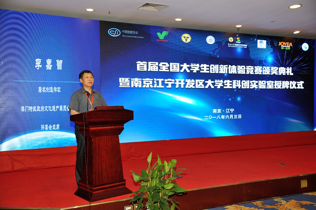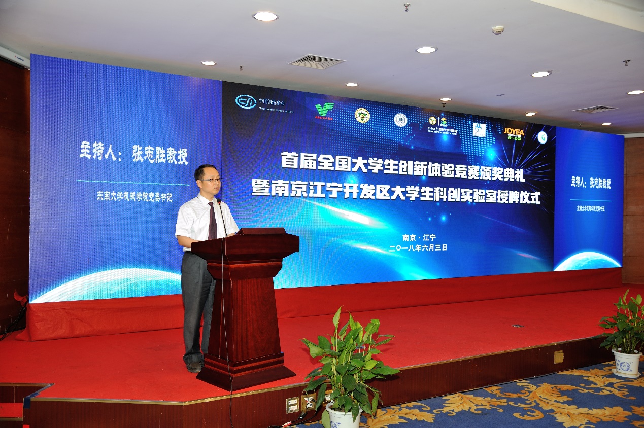 随后,6 月 3 日下午首届全国大学生创新体验竞赛颁奖典礼暨南京江宁开发区大学生科创实验室授牌仪式在东南大学九龙湖校区隆重举行,南京市领导、江宁区领导、东南大学领导出席活动并讲话。江宁开发区管委会、东南大学相关部处及院系、中国创造学会及相关单位的工作人员等近 300 人参加了活动。本次活动分为首届全国大学生创新体验竞赛颁奖及南京江宁开发区大学生科创实验室授牌两个环节,分别由安博在线注册党委书记张志胜和南京江宁开发区科技人才局局长张洋主持。东南大学副校长吴刚教授,南京市科委副主任陈为生,中国创造学会常务副理事长兼秘书长张亚雷教授等嘉宾出席了本次活动。