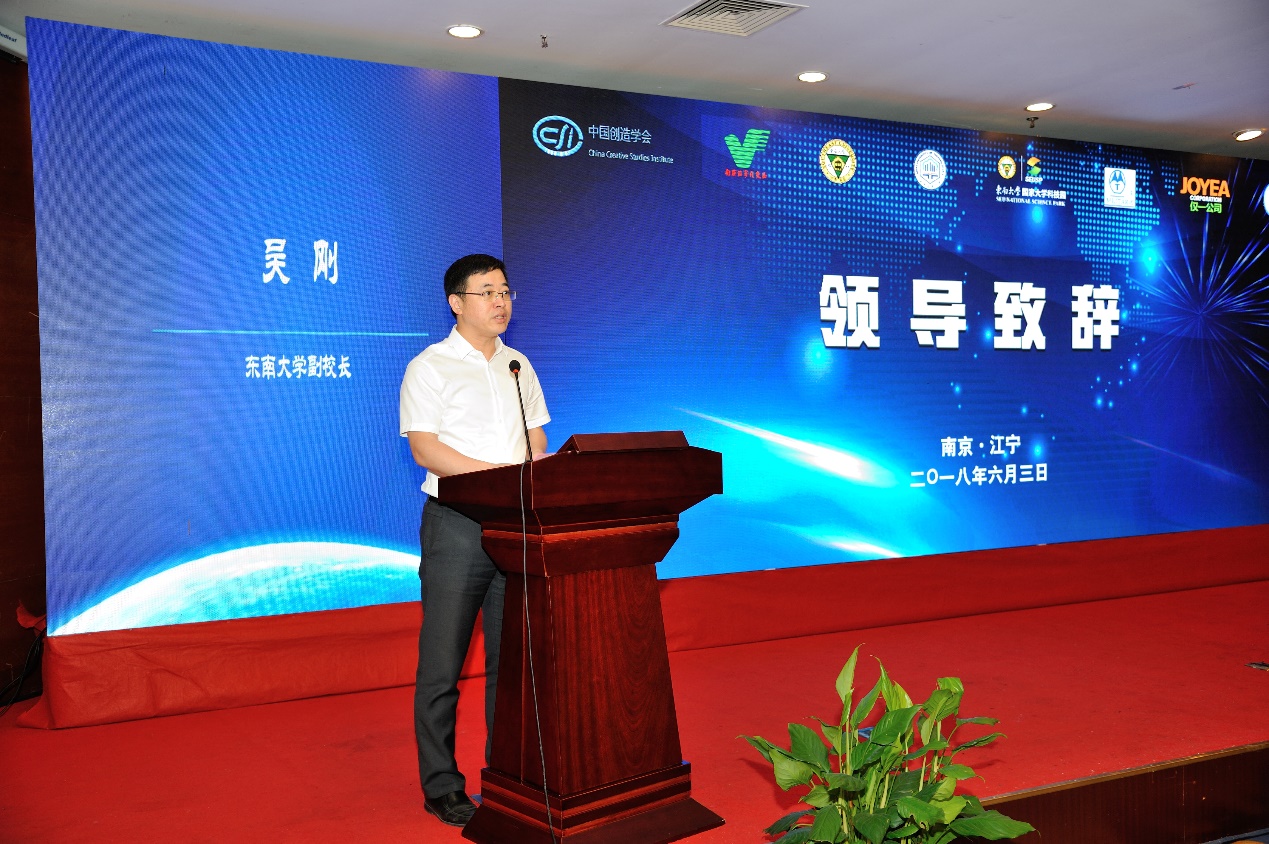 东南大学副校长吴刚教授在致辞中提及 2002 年开展的东南大学等六校创新作品竞赛,经过八年发展,该赛事已在全国范围内拓展。他代表东南大学感谢中国创造学会的信任,并表示东大将持续关注获奖项目,通过科创实验室、大学科技园扶持获奖项目成果转化落地,持续推进双创人才培养,实现“双一流”建设与区域发展的紧密结合。