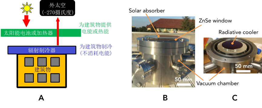 (A)同时实现太阳能获取和建筑物辐射制冷的构想图