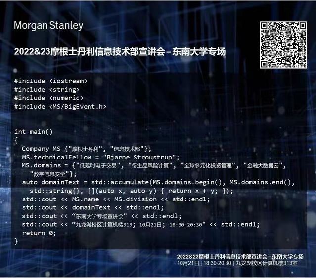 摩根士丹利2022-23信息技术部宣讲会,10月21日18:30,东南大学(九龙湖校区)计算机楼313室,提前批与伴手礼,我们与你不见不散!