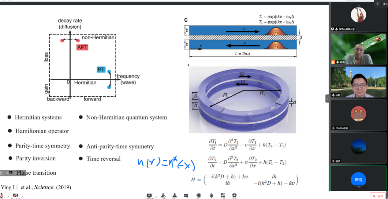 2022年6月3日,由东南大学机械学院联合发起的传热学-光子学-拓扑学第一次圆桌讨论会圆满结束。 来自美国宾州州立大学(Pennsylvania State University)机械系的朱林晓教授,上海交通大学物理与天文学院的袁璐琦教授,和东南大学机械学院的陈震教授参与了讨论。三位教授就各自的研究领域进行了深入的探讨,将光子学、拓扑学、传热学进行了揉合。理论物理学出身的袁璐琦教授从基础物理的层面,对近期的热点科学研究“从量子力学的对称性重新审视传热现象”进行了深入浅出的讲解,打破了行业间“隔行如隔山”的壁垒,令参与讨论的其他两位教授和旁听的听众受益匪浅。
