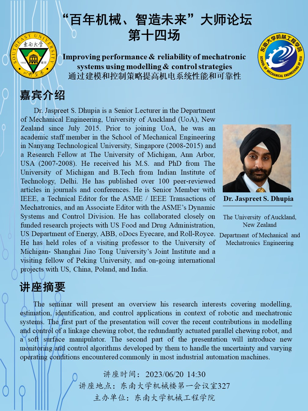 Dr.JaspreetS. Dhupiais a Senior Lecturer in the Department of Mechanical Engineering, University ofAuckland (UoA),New Zealand since July 2015. Prior to joining UoA,he was an academic staff member in the School of Mechanical Engineering inNanyang Technological University, Singapore (2008-2015) and a Research Fellowat The University of Michigan, Ann Arbor, USA (2007-2008). He received his M.S.and PhD from The University of Michigan and B.Techfrom Indian Institute of Technology, Delhi. He has published over 100peer-reviewed articles in journals and conferences. He is Senior Member withIEEE, a Technical Editor for the ASME / IEEE Transactions of Mechatronics, andan Associate Editor with the ASME’s Dynamic Systems and Control Division. Hehas collaborated closely on funded research projects with US Food and DrugAdministration, US Department of Energy, ABB, oDocsEyecare,and Roll-Royce. He has held roles of a visiting professor to the University ofMichigan- Shanghai Jiao Tong University’s Joint Institute and a visiting fellowof Peking University, and on-going international projects with US, China,Poland, and India.