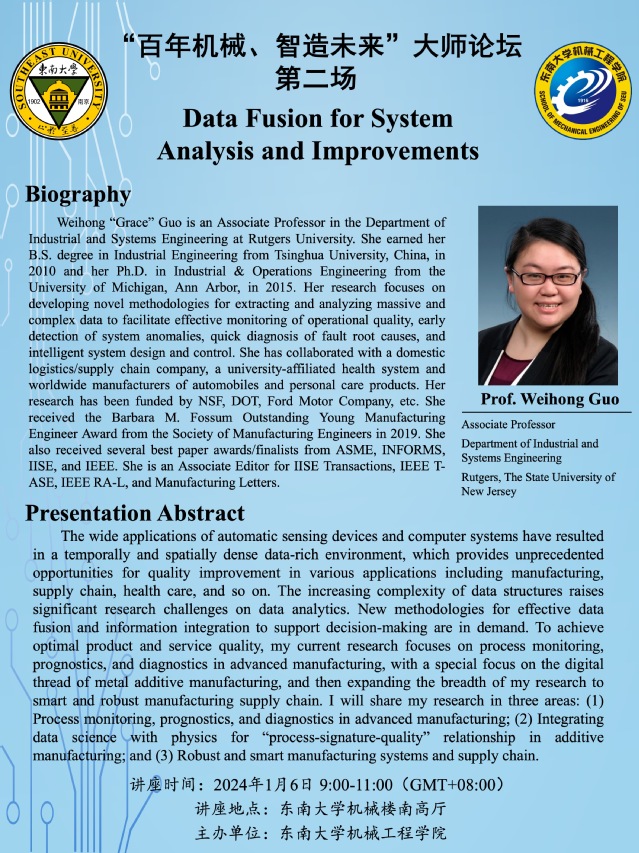 The wide applications of automatic sensing devices and computer systems have resulted in a temporally and spatially dense data-rich environment, which provides unprecedented opportunities for quality improvement in various applications including manufacturing, supply chain, health care, and so on. The increasing complexity of data structures raises significant research challenges on data analytics. New methodologies for effective data fusion and information integration to support decision-making are in demand. To achieve optimal product and service quality, my current research focuses on process monitoring, prognostics, and diagnostics in advanced manufacturing, with a special focus on the digital thread of metal additive manufacturing, and then expanding the breadth of my research to smart and robust manufacturing supply chain. I will share my research in three areas: (1) Process monitoring, prognostics, and diagnostics in advanced manufacturing; (2) Integrating data science with physics for “process-signature-quality” relationship in additive manufacturing; and (3) Robust and smart manufacturing systems and supply chain.