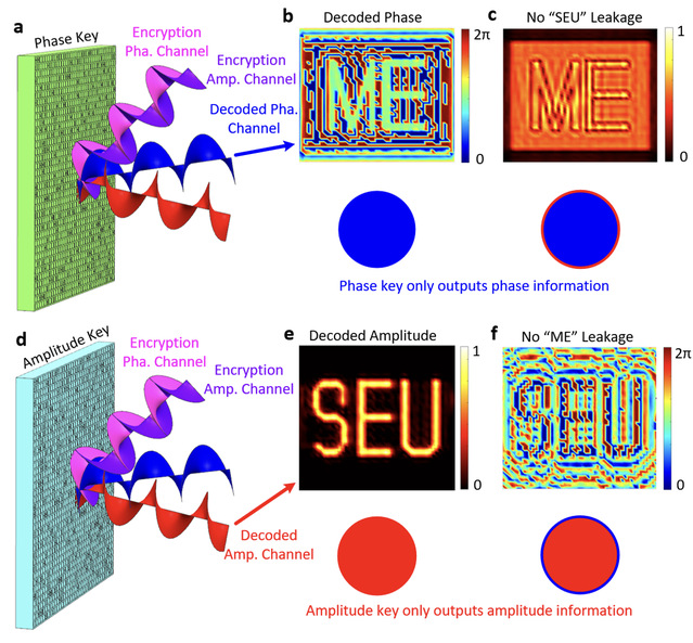针对这一挑战,张辉/朱一凡教授团队基于可独立调制反射声波幅值与相位的超表面对双信道全息图像进行加密与解密。由于直接传输的双通道全息图像信息具有耦合性,即幅值与相位信道图像互相耦合造成信息泄漏,直接威胁通讯安全。通过加密超表面对幅值和相位信道引入随机数矩阵,从而使得加密声场中的全息图变为乱码(图2)。在加密声场中的工作位置放入相应信道的密钥超表面即可还原重建原始全息图像信息。不同信道的密钥超表面只能解密得到各自信道的原始图像信息,不会出现信道耦合造成信息泄漏(图3),从而实现双通道超全息信息解密:相位通道读取字母“ME”(图3b), 幅值通道读取字母“SEU” (图3e)。