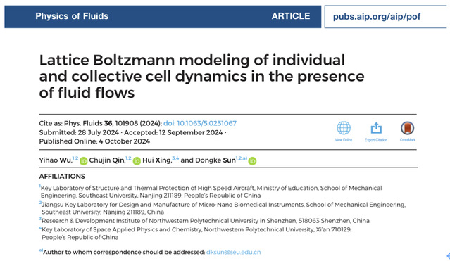 近日,我院2023级硕士研究生吴意豪在格子玻尔兹曼方法生物流体建模方面取得新进展,相关研究成果以“Lattice Boltzmann modeling of individual and collective cell dynamics in the presence of fluid flows”为题发表在《Physics of Fluids》(流体物理学,PoF)。该期刊创建于1958年,致力于发表原创理论、计算和实验贡献,以了解气体、液体和复杂或多相流体的动力学,是美国物理联合会AIP旗下、中科院分区物理类流体与等离子体领域一区的期刊。