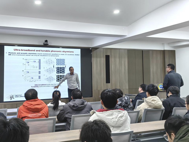 在讨论环节中,Badreddine Assouar教授积极解答师生提出的问题,进一步介绍如何使用自旋角动量作为新的自由度来操纵波的传播,并展示在光子和声学系统中产生斯格米子的具体例子。