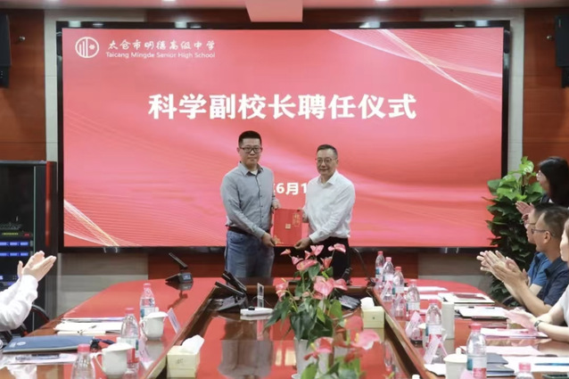 6月13日,太仓市明德高级中学开展科技特色建设专家指导活动。活动现场举行了科学副校长聘任仪式,安博在线注册副院长孙东科教授受聘加盟太仓市明德高级中学科技教育团队,太仓市教育局局长李广耀为孙东科教授颁发科学副校长聘书。