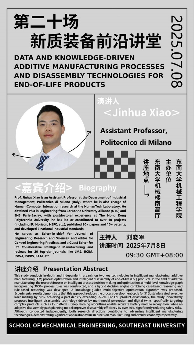 2025年机械学院“新质装备前沿讲堂”第二十场:Prof. Jinhua Xiao——Data and Knowledge-driven additive manufacturing processes and disassembly technologies for end-of-life products