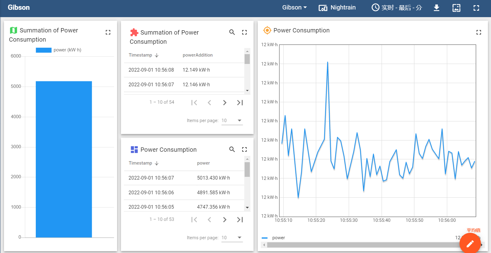 3、数据显示。设计仪表盘界面,接入设备实时用电数据及统计数据并显示。