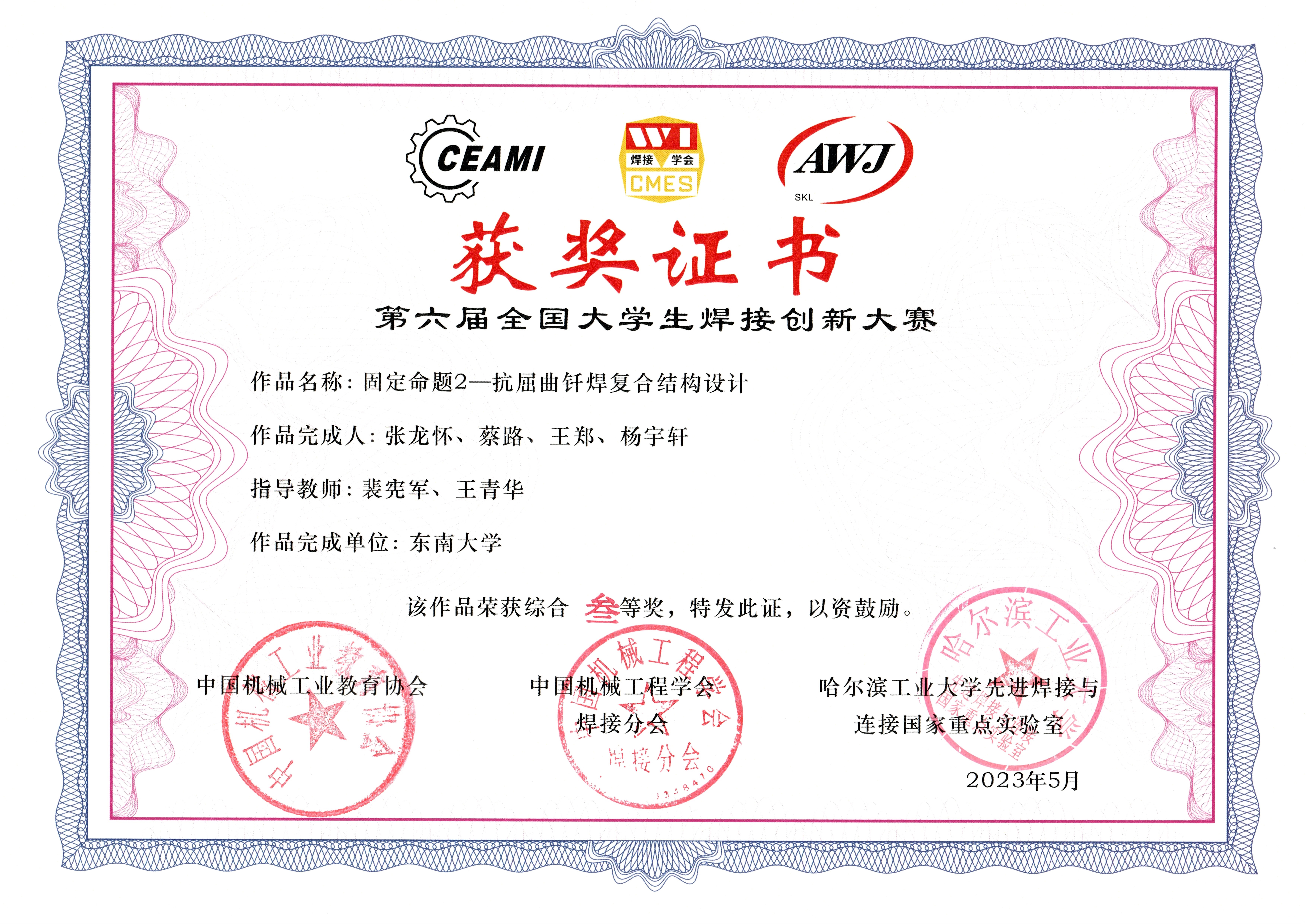 2023526日至28日,第六届全国大学生焊接创新大赛暨第四届焊接技术与工程专业委员会成立大会在河南科技大学成功举办。本次大赛由中国机械工业教育协会、中国机械工程学会焊接分会、哈尔滨工业大学先进焊接与连接国家重点实验室主办。东南大学本届大赛共派出4支队伍参赛,最终获得一等奖1项、二等奖1项、三等奖2项。
