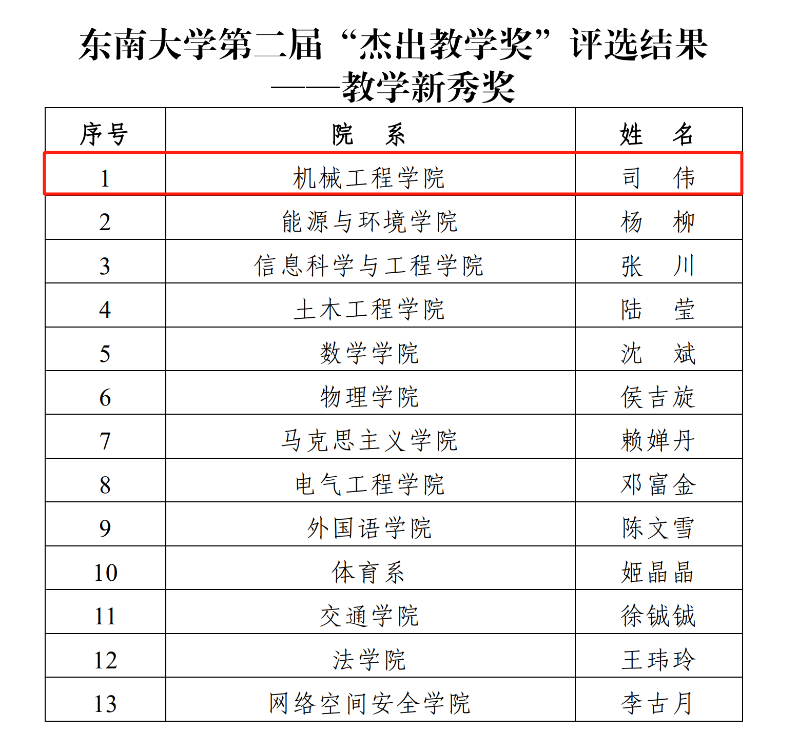 近日,东南大学公布了第二届“杰出教学奖”评选结果,我院司伟副教授荣获“教学新秀奖”。