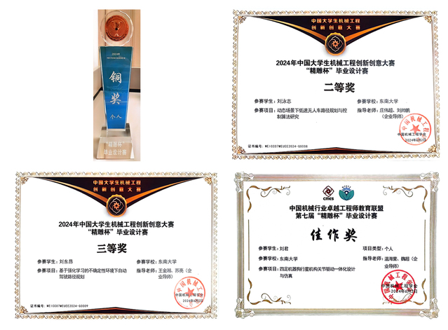在决赛环节中,经过现场评委专家审阅、现场答辩和实物演示等多环节紧张激烈地角逐,我院由庄伟超、刘帅鹏(企业导师)指导,刘泳志同学完成的毕设项目《动态场景下低速无人车路径规划与控制算法研究》获全国二等奖,全国个人铜奖;由王金湘、苏亮(企业导师)指导,刘东昂同学完成的毕设项目《基于强化学习的不确定性环境下自动驾驶路径规划》获全国三等奖、全国优胜奖;由温海营、魏超(企业导师)指导,刘君同学完成的毕业设计项目《四足机器狗行星机构关节驱动一体化设计与仿真》获全国三等奖,全国佳作奖。